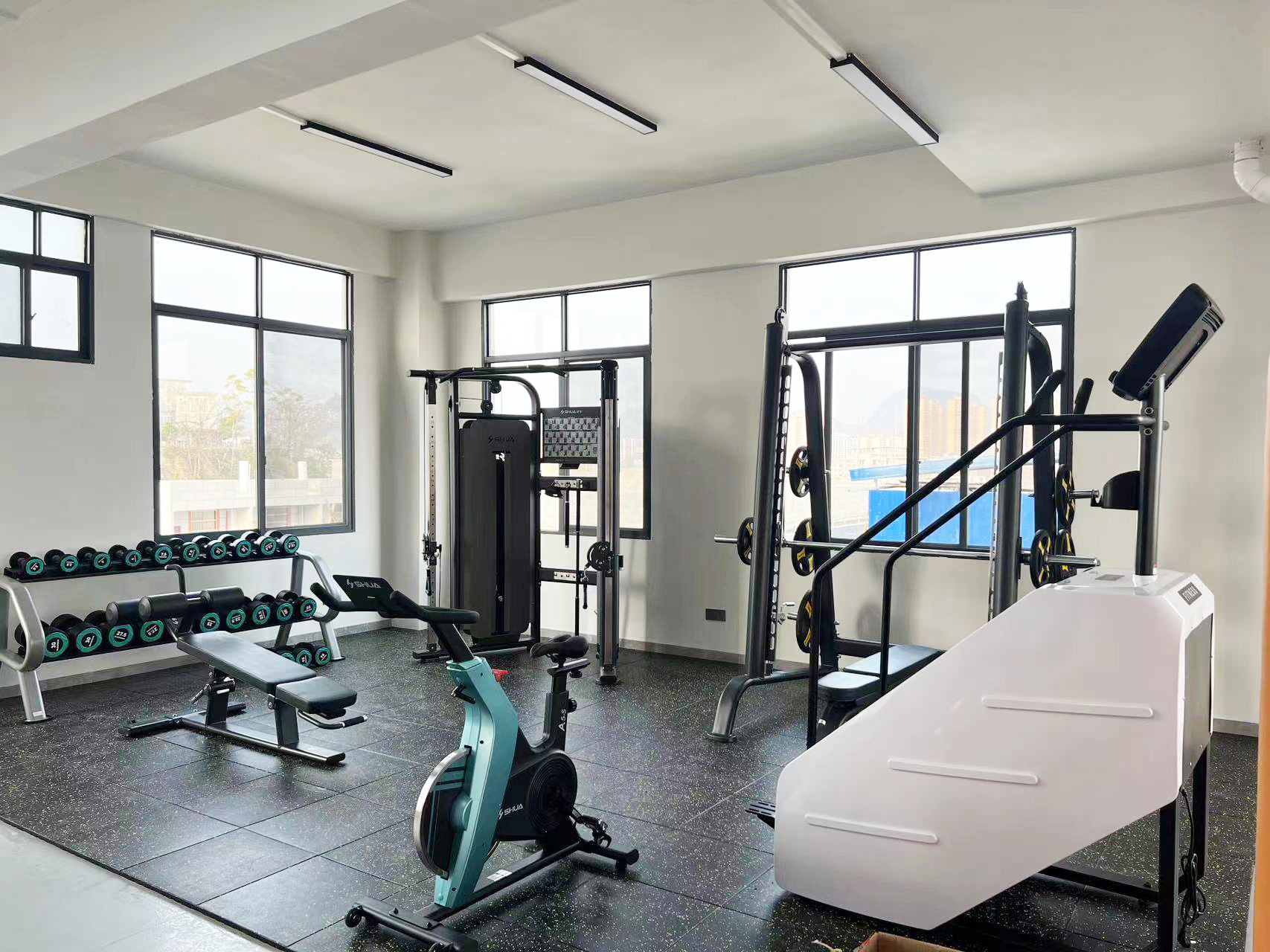 力量器械配置了开元可调式双滑轮多功能训练器(小飞鸟)SH-G6820、史密斯机训练架SH-G6853、腹肌练习椅SH-G6879 、康健10付哑铃套组,依据锻炼方式不同,能够满足日常多肌群训练(胸、肩、背、腿),让企事业职工在有限的器材里能够得到全方位锻炼身体肌肉。让职工身体更健硕,在工作中释放激情活力,打造完美职场形象。在运动过程中增进职工之间的情感交流,促进各部门紧密融合,增强职工归属感,增强企事业的凝聚力。