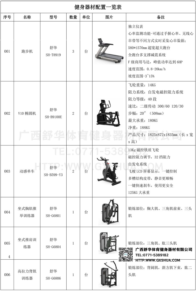 1.开元V9高端跑步机SH-T8919*3台-580*1570mm超宽超大跑台-跑感舒适,跑台整体安全稳定;全跑台多支撑减震平台,保证跑台超强支撑力,达到180kg支撑,满足专业健身房需求。F级商用马达-超强马达,AC 3.0HP 交流,峰值功率达到6HP,F级商用品质。速度范围达到0.8-20km/h;V9跑步机可实现跑台扬升功能,坡度范围-3~15%,满足客户不同的锻炼需求。