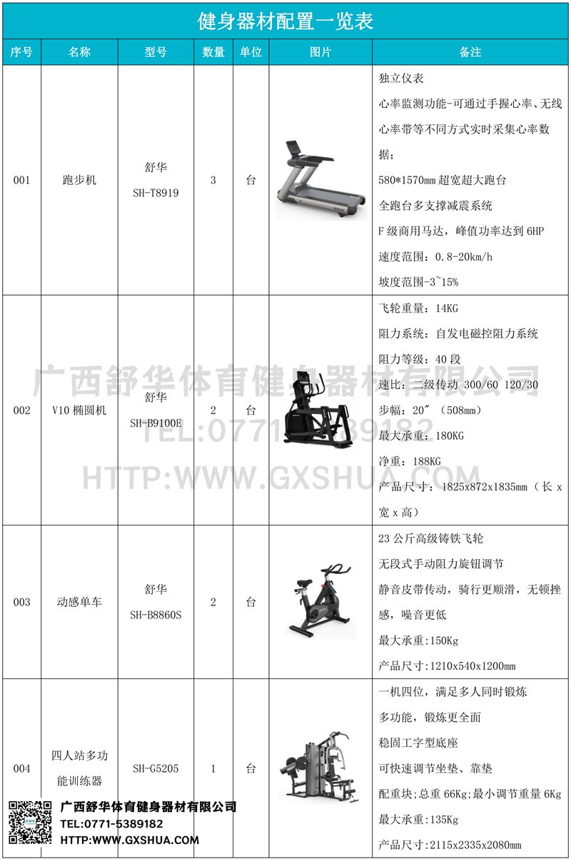 1.开元V9跑步机SH-T8919*3台-独立仪表-简洁大气,全新外观设计,健康运动新选择;心率监测功能,可通过手握心率、无线心率带等不同方式实时采集心率数据;580*1570mm超宽超大跑台-跑感舒适,跑台整体安全稳定;全跑台多支撑减震平台,保证跑台超强支撑力,达到180kg支撑,满足专业健身房需求。F级商用马达-超强马达,AC 3.0HP 交流,峰值功率达到6HP,F级商用品质。速度范围达到0.8-20km/h;V9跑步机可实现跑台扬升功能,坡度范围-3~15%,满足不同的锻炼需求。