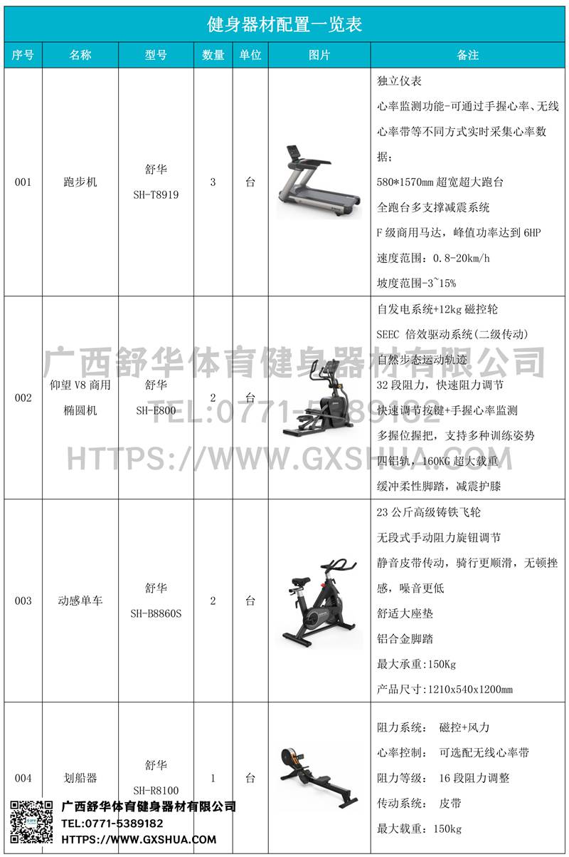 1.开元V9跑步机SH-T8919*3台-580*1570mm超宽超大跑台-跑感舒适,跑台整体安全稳定;全跑台多支撑减震平台,保证跑台超强支撑力,达到180kg支撑,满足专业健身房需求。F级商用马达-超强马达,AC 3.0HP 交流,峰值功率达到6HP,F级商用品质。速度范围达到0.8-20km/h;V9跑步机可实现跑台扬升功能,坡度范围-3~15%,满足客户不同的锻炼需求。