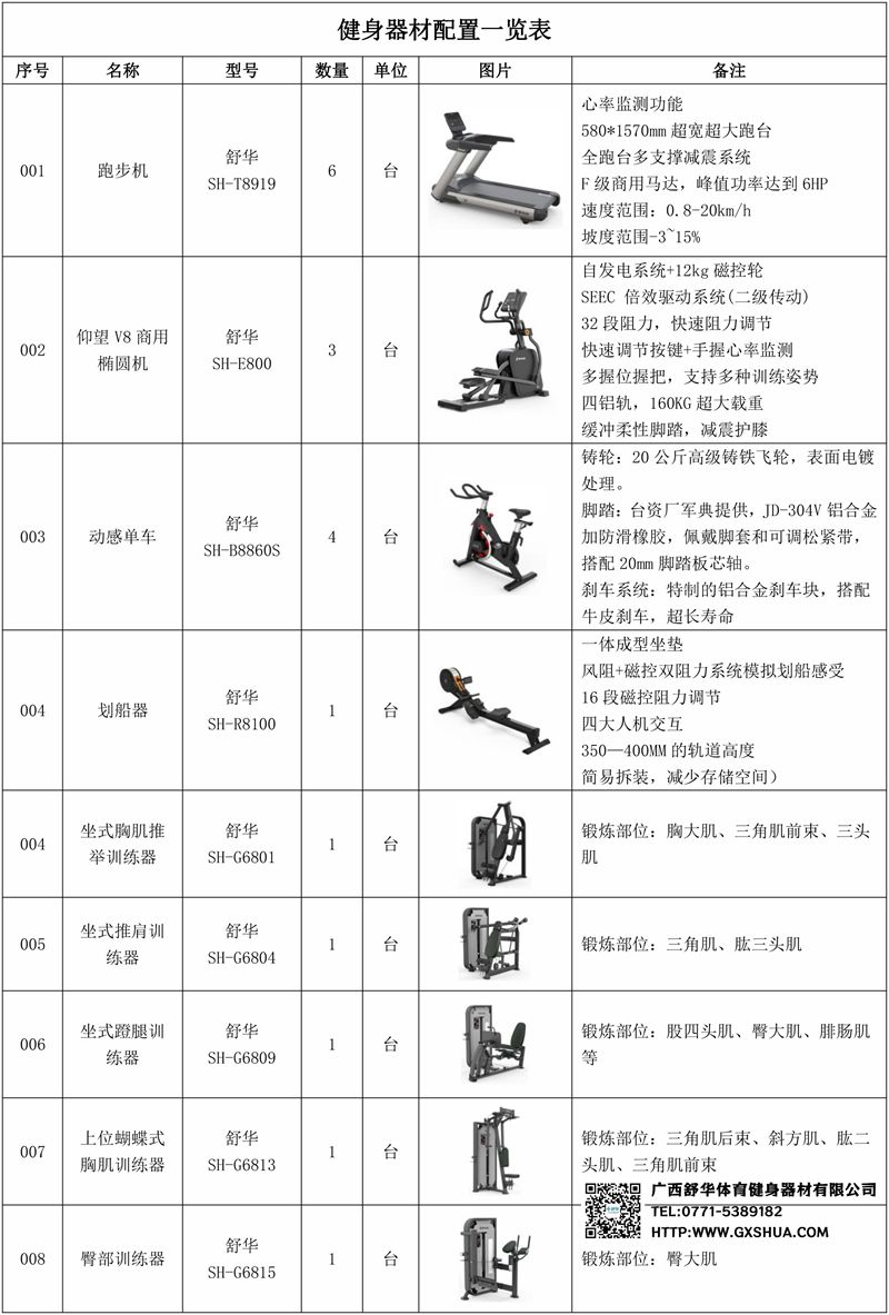 1.开元V9智能跑步机SH-T8919*6台-独立仪表-简洁大气,全新外观设计,健康运动新选择;心率监测功能,可通过手握心率、无线心率带等不同方式实时采集心率数据;580*1570mm超宽超大跑台-跑感舒适,跑台整体安全稳定;全跑台多支撑减震平台,保证跑台超强支撑力,达到180kg支撑,满足专业健身房需求。F级商用马达-超强马达,AC 3.0HP 交流,峰值功率达到6HP,F级商用品质。速度范围达到0.8-20km/h;V9跑步机可实现跑台扬升功能,坡度范围-3~15%,满足客户不同的锻炼需求。